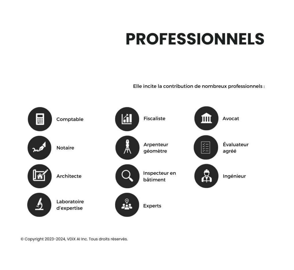 Le contenu des présentes, ou du site dont il provient, ne doit en aucune façon être interprété, considéré ou utilisé comme s’il constituait des conseils sur le plan, financier, comptable, fiscal, juridique, du droit foncier et de la géomatique, de l’évaluation professionnelle, des assurances, des contrats et obligations, de l’inspection en bâtiment, de l’expertise technique, géologique, hydraulique et scientifique, des prélèvements et analyses en laboratoire, environnemental, aussi bien qu’architectural, du design, construction, rénovation, technologie, que de l’ingénierie. VDiX AI Inc. et ses partenaires en contenu ne peuvent être tenus responsables des dommages que vous pourriez subir dans le cadre d’une telle utilisation.
