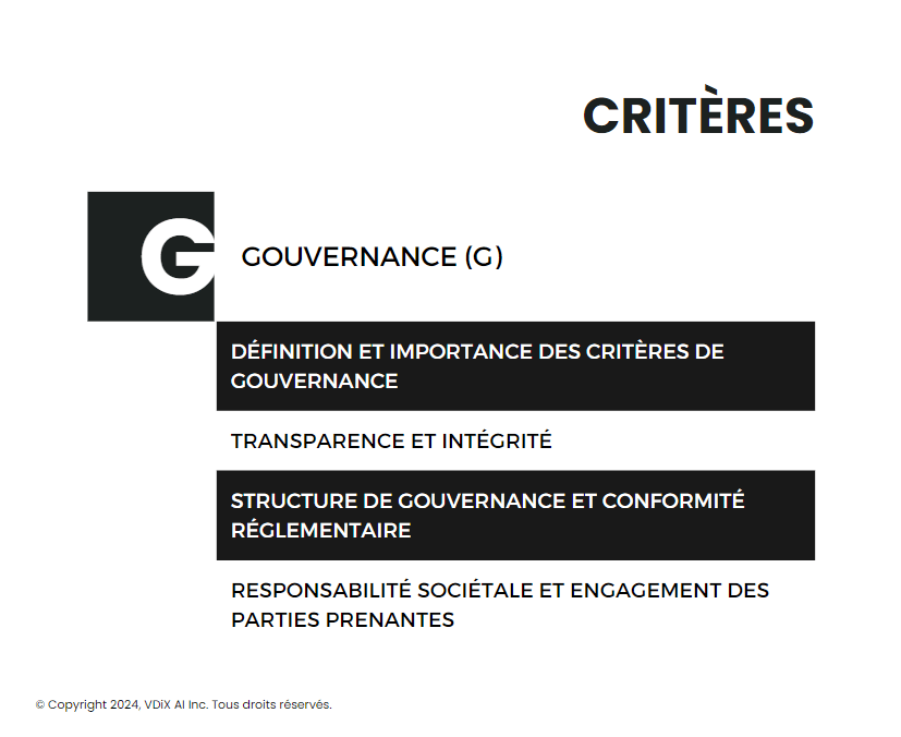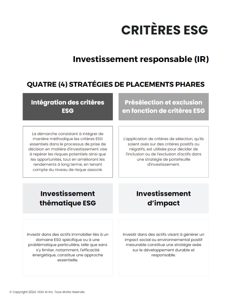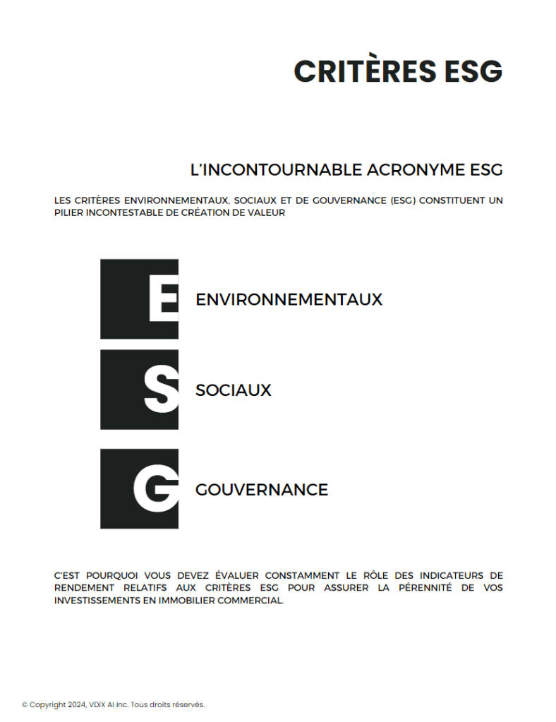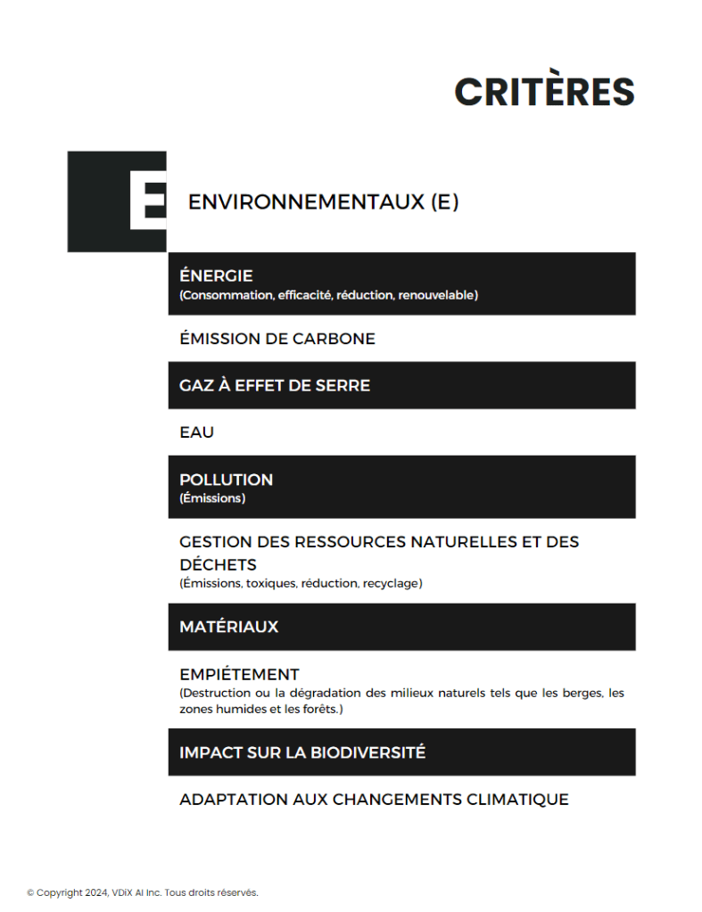 L’intégration des critères ESG représente un grand défi pour les investisseurs immobiliers, mais c’est aussi une opportunité significative. Cela leur permet, sans s’y limiter, notamment, d’accéder à des financements avantageux, comme ceux proposés par le programme APH Sélect de la SCHL, en fixant des objectifs d’efficacité énergétique. Cette approche proactive est essentielle pour rester compétitive et répondre aux attentes des parties prenantes, même si elle peut varier en fonction de la taille et de la nature des projets immobiliers. En investissant dans la durabilité, les investisseurs peuvent exploiter les opportunités offertes par les critères ESG pour créer de la valeur et pour générer des bénéfices et de la richesse à long terme. Explorez les principales thématiques ESG et critères à prendre en compte :