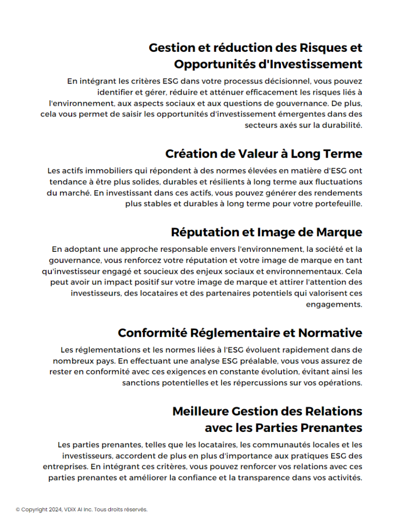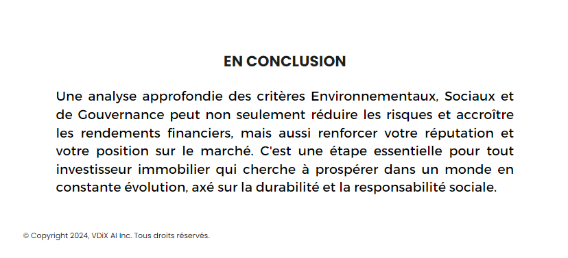 Le contenu des présentes, ou du site dont il provient, ne doit en aucune façon être interprété, considéré ou utilisé comme s’il constituait des conseils sur le plan, financier, comptable, fiscal, juridique, du droit foncier et de la géomatique, de l’évaluation professionnelle, des assurances, des contrats et obligations, de l’inspection en bâtiment, de l’expertise technique, géologique, hydraulique et scientifique, des prélèvements et analyses en laboratoire, environnemental, aussi bien qu’architectural, du design, construction, rénovation, technologie, que de l’ingénierie. VDiX AI Inc. et ses partenaires en contenu ne peuvent être tenus responsables des dommages que vous pourriez subir dans le cadre d’une telle utilisation.